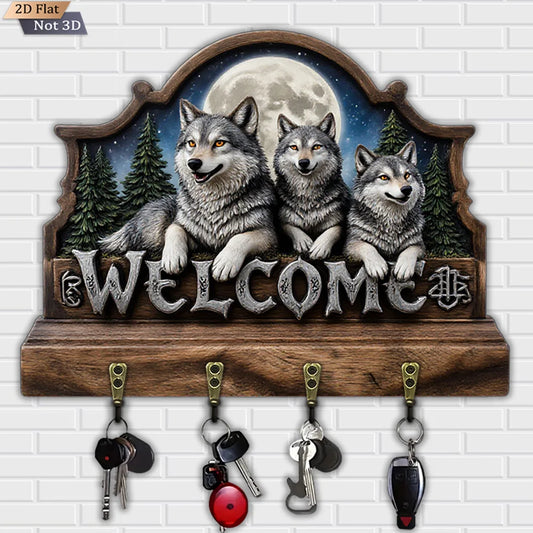 2D Moonlight Wolf Wood Key Rack - Welcome Wolves Key Holder 4 Metal Hooks for Witch Decor