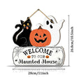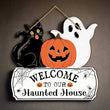 Halloween Hanging Decoration - Black Cat Pumpkin and Ghost Welcome Sign - Witchy Wooden Sign for Gothic Home Decor