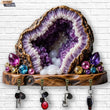 2D Amethyst Gemstone Wicca Wood Key Rack - Healing Crystal Key Holder 4 Metal Hooks for Witch Decor