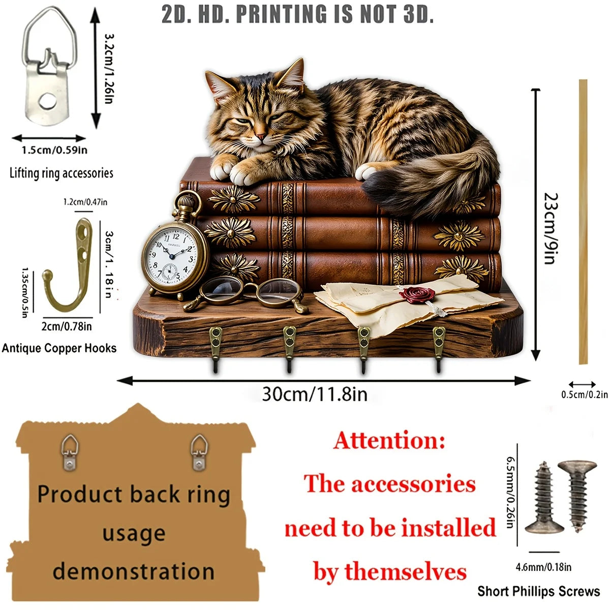 2D Vintage Cat Key Holder 4 Metal Hooks - Mystic Wood Key Rack