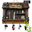 2D Witch Wand Shop Key Holder 4 Metal Hooks - Wicca Wood Key Rack