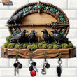 2D Gothic Crows Black Raven Wooden Key Holder 4 Metal Hooks - Witchy Wood Key Rack