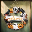 Halloween Welcome Wreath Decor with Cat Raven Skull Pumpkins Ghost - Witch Wooden Sign for Gothic Halloween Decor