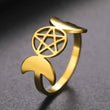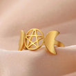 Adorning the center is a meticulously detailed Pentagram ring, revered in Witchcraft jewelry and Pagan jewelry as a sign of balance, the five elements, and protection. This pentagram protection ring acts as a spiritual shield, guarding against negative energies and promoting positive vibes.