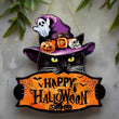 Spooky Halloween Wooden Door Hanger with Witchy Black Cat